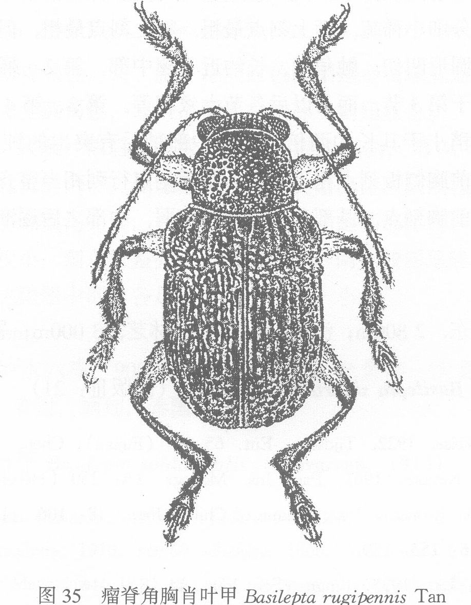 头部刻点疏,额唇基具皱纹和刻点,头顶十分隆起,复眼之间有一条深横沟。触角达体长之半,末端5节展宽。前胸近于锥形,十分隆起,光滑,刻点浅而稀疏。小盾片光滑...
