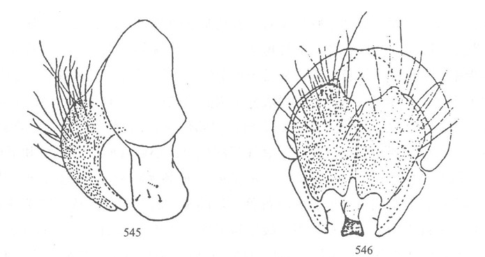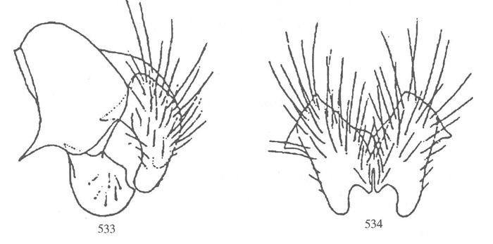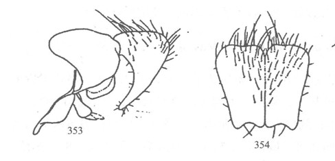形态 ♂:体长5.0—6.5mm,眼疏生短纤毛;额最狭处约为前单眼宽的1.6倍;下眶鬃8—10对,达于前单眼水平;侧颜约为触角第三节宽的0.58倍;触角暗褐色,第三节长约为其宽的2.5倍;芒羽状,最长芒毛超过触角第三节宽的1/2;口上片不突出于额角;颊和下后...