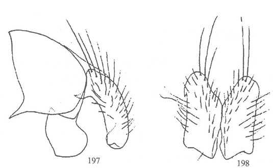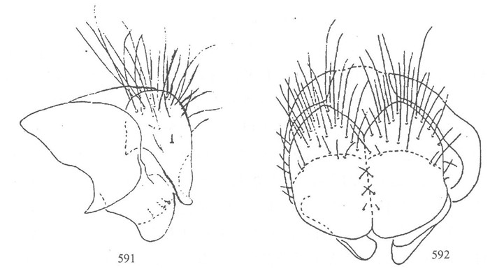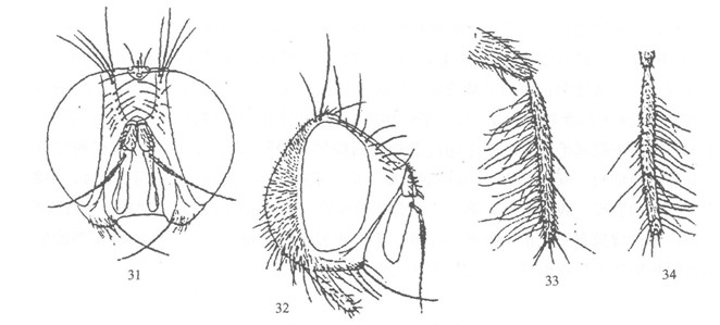 形态 ♂:体长7.0—7.5mm。眼具较密长纤毛,上内方小眼面稍增大;额等于前单眼宽,问额如线;下眶鬃5—6对,分布在侧额下半部,上半部