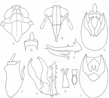 、唇基、颊和触角污淡黄色。胸部腹面除后胸部分微带黑褐色外为淡黄色;前、中足基节基部大半黑褐色,其余为淡黄色。前翅透明略带淡黄晕,端区后半微烟污。腹部背面黑褐色,各节基缘浅黑褐色,向端缘渐...