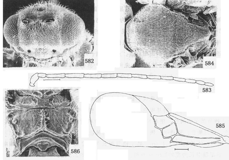 雌:体长8mm。体黑色;上颚端部红褐色;触角鞭节及翅基片黑褐色;足跗节褐色;翅脉浅褐色;翅透明;体毛白色;前胸侧叶突,后胸盾片被毡状毛斑;腹部2-4节背板具宽的白色毛带;腹部第5节背板末端毛黄色。