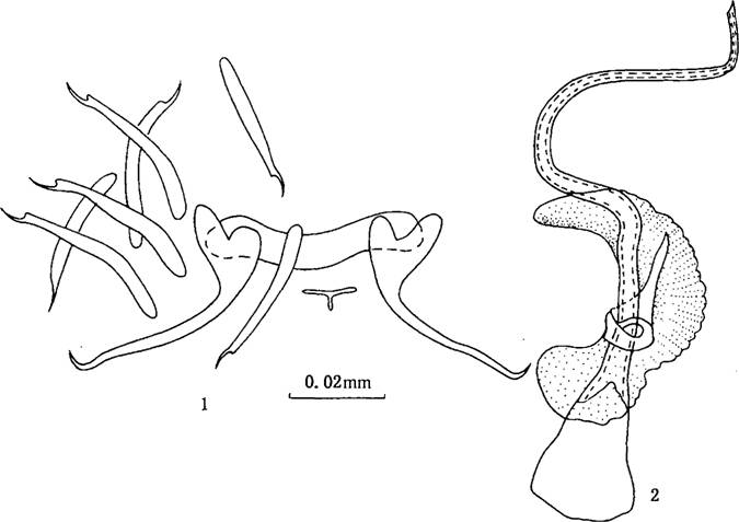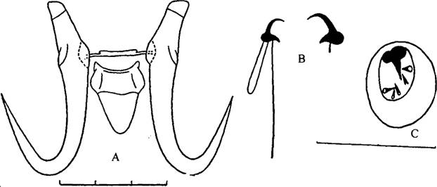 据中央大钩和交接管的形状特征易从他种区别开来,体长0.95—1.12mm,宽0.18-0.22mm。咽略呈长卵形,大小0.029--0.064 × 0.O25—0.052mm。后吸器与体分界明显,大小0.1 2 × 0.1 4mm,具2...