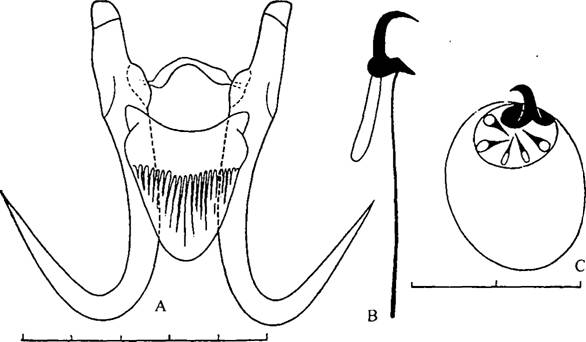 形态 体长0.5mm。边缘小钩全长0.036---0.043mm,钩体长0.008—0.011mm。中央大钩全长0.016-0.083mm,基部长0.045-0.058mm,钩尖长0.032---0.041mm,内突0.015---0.028mm。腹联结...
