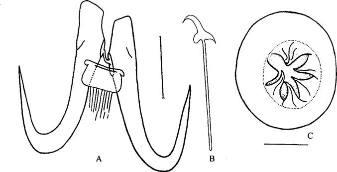 形态 体长0.3mm。边缘小钩全长0.024mm,钩体长0.005mm。中央大钩全长0.051mm,基部长0.037mm,钩尖长0.026mm,内突0.016mm。腹联结棒大小0.006×0.017mm,棒裙高0.012mm。背联结棒大小0.002×0....