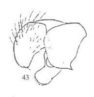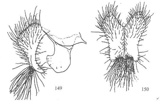一枚。后翅灰褐色,缘毛灰白色。雄性外生殖器:爪形突长,末端有凹陷;抱器瓣卵圆形;抱器腹无游离部分;抱器端有长毛;抱器背基突两侧有牛角状突起;阳茎细而弯曲。雌性外生...