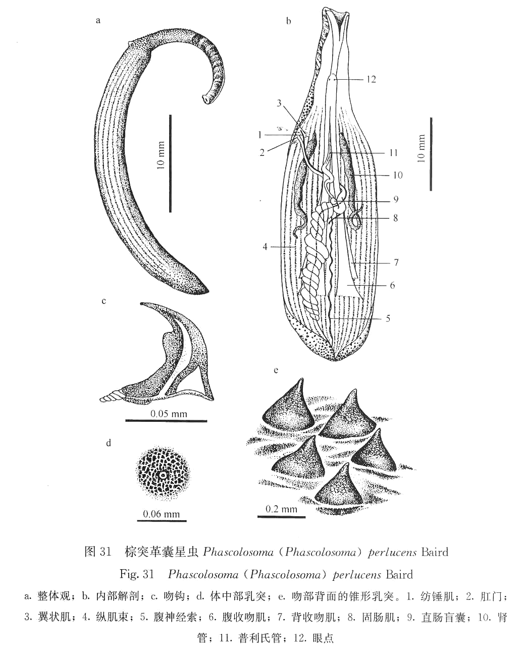 体长15一30mm,吻长5一8mm,体壁薄,半透明。纵肌束18—20束,很少有分支。环肌连续,不分离成束。吻部背面着生大形顶端尖细的锥形乳突,每突