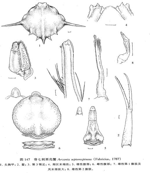 形态描述 头胸甲呈宽菱形,背面中央隆起,自额中线向后至肠区刺基部有一条纵列隆
