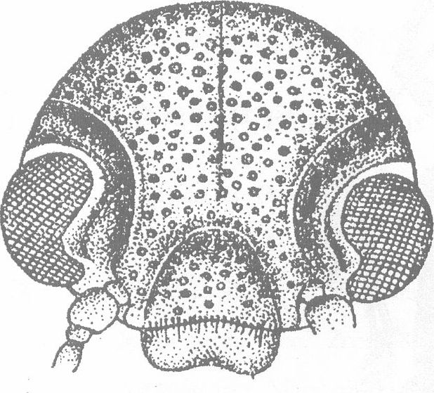 而深,较密,在头顶处略呈皱纹状;额和头顶隆起,中间有一条不明显的细沟纹;唇基凹下,两侧各有一条纵沟纹,此纹向上伸与额前方两侧的深凹窝相连;在复眼的内侧和上方有一条向后展宽的深斜沟(图89)。触角伸达鞘翅肩部;第1节膨...