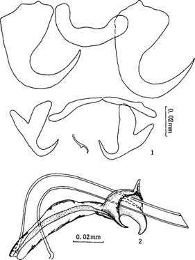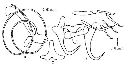 体间急骤变细,成为后吸器上的一细柄,柄长可达0.220 mm,直径0.044-0.050 mm。后吸器的大小为0.13...