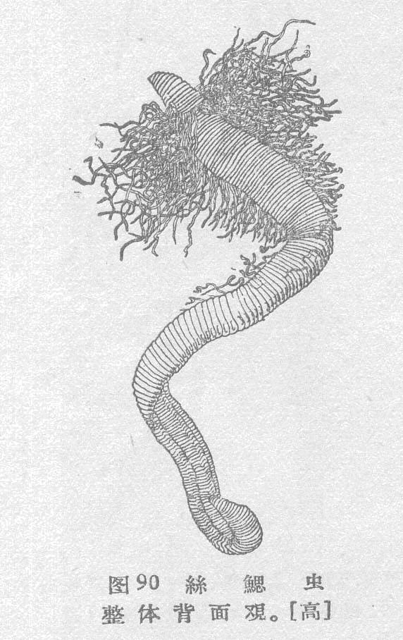 身体背面隆起,腹面扁平,长60-150毫米,环节数目可达300个左右。头部为圓錐状,无眼点,亦无其他附肢,体前端有許多絲状的鰓絲,由各疣足的背方伸出,往后漸次稀少。在第5、6刚毛节或第6、7刚毛节之間,有一横排鰓絲,由疣足直达背中綫,每侧約有20