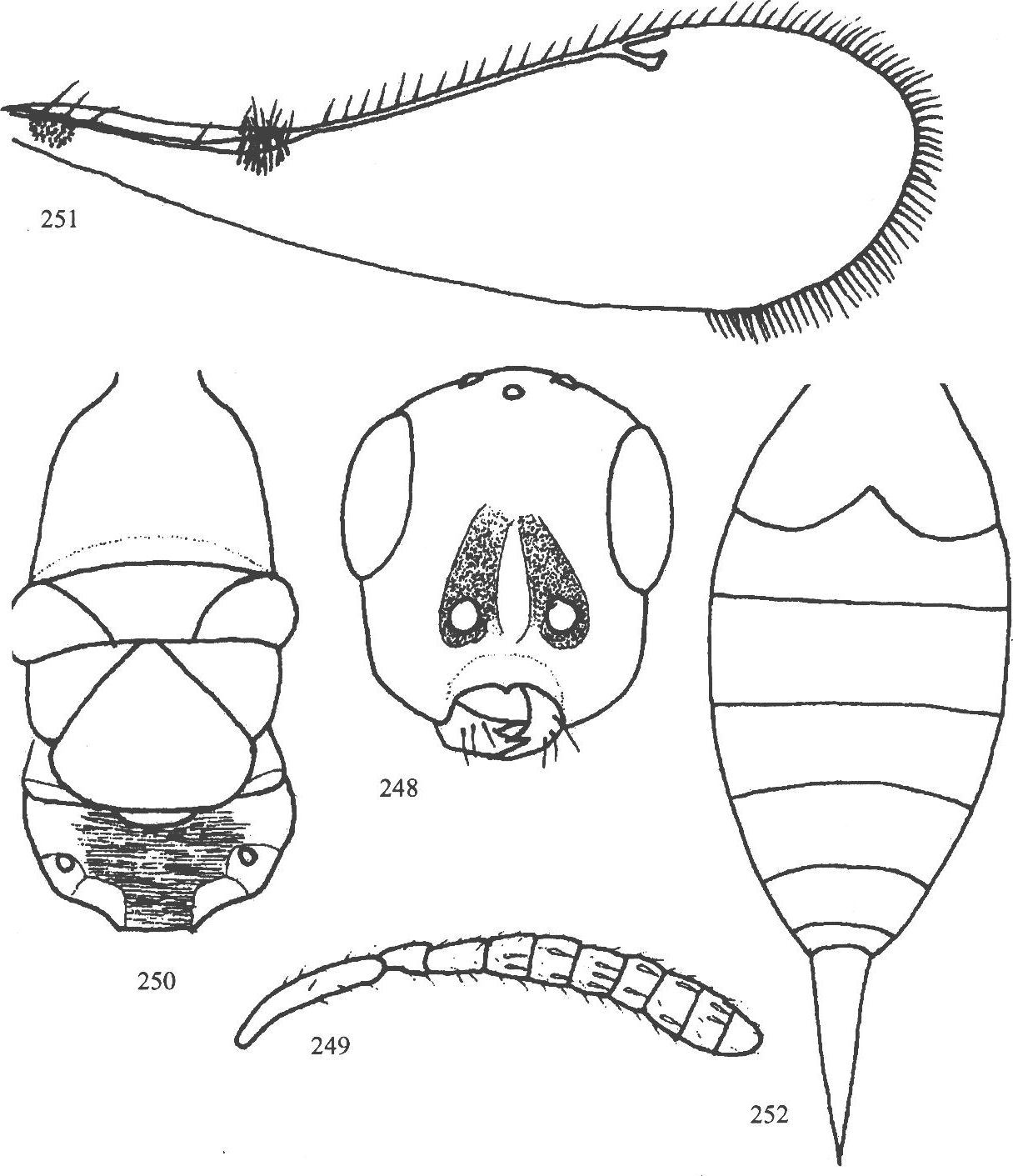 头前面观(图248,图版Ⅲ:1),高为宽的1.2倍多(38:31);复眼小被散毛,复眼高、复眼间距的相对长度为19:20;触角位于复眼下线下方...