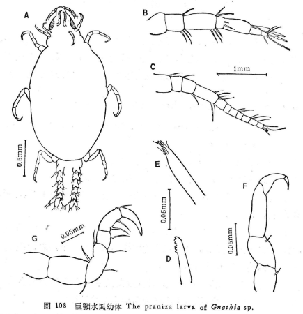 幼体(图108A)头部略呈钝三角形,其后的2个胸节较头部稍宽,胸部自第三节起愈合成长大的椭圆形。腹部细长如尾,6节,前5节的宽度约相等,长度从前向后逐节稍增长,第六节为尾节,略呈倒三角形,末端有2刚毛。