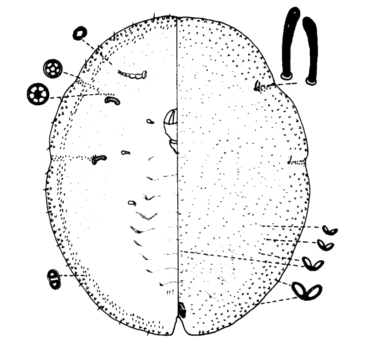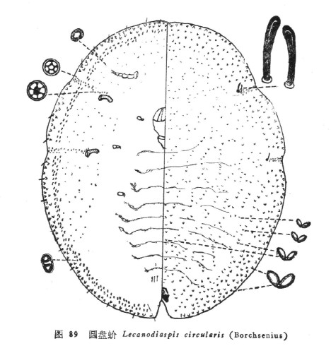 雌成虫:虫体几乎呈圆形,体长约5mm。触角7或8节,其中第3节最长。口器较发达。