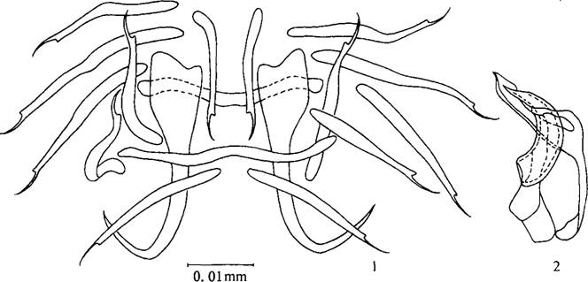 成虫形态 虫体小型,体长0.309-0.386mm,体宽0.063-0.l05mm。后吸器大小0.045---0.052×0.065---0.077mm。边缘小钩发育完全,长0.019---0.034mm。中央大钩全