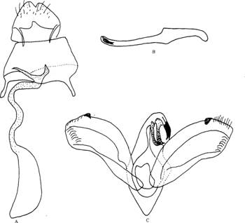 色横线。腹部背面和末端匙形毛簇暗褐色,具浅褐灰色中线,1~4节两侧后半部褐灰色,6~9节两侧各有1条黑