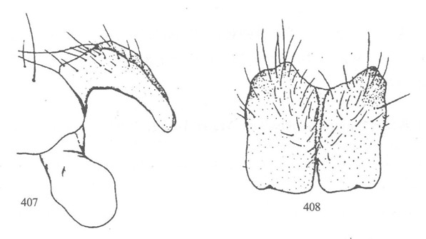 ;额较宽,最狭处约为触角第三节宽的3倍;侧额为间额宽的1/2,两者均覆以浅灰白粉被,但间额底色暗;下眶鬃5对,均长大,分布在侧额下方3/5段内,上方2/5