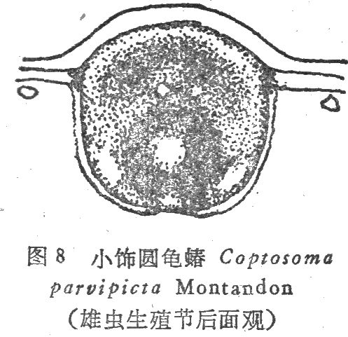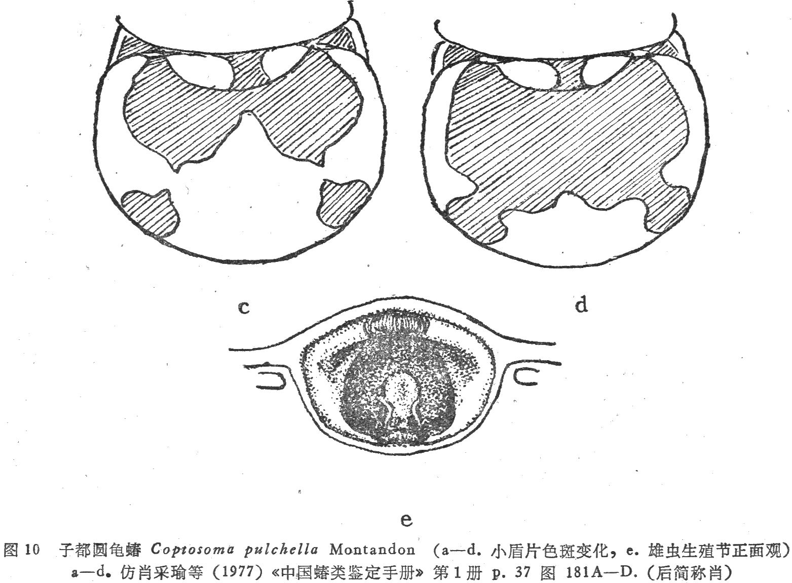 成虫:雌虫体长4.4毫米,宽3.8毫米。雄虫体长3.8—3.9毫米,宽3.2毫米。卵圆形,黑色有光泽,具同色刻点。