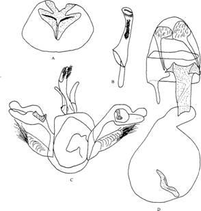 形,内衬黄褐色边,中室下方有1条黑色纵线与内线相连,使整个内线看似“W”形;外线不清晰,由1列黑点组成,斜向外曲;R5~...