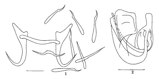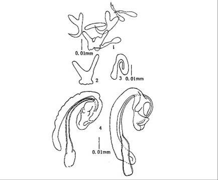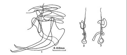 边缘小钩全长0.01 7—0.022mm.中央大钩全长0.030—0.032mm,基部长0.034mm,外突0.003—0.005mm,内突0...