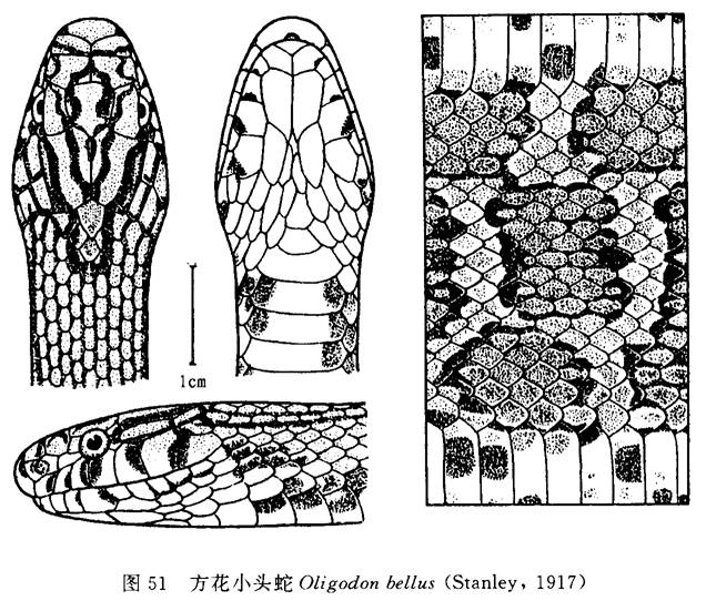 鉴别特征 头背具有一“Y”形斑纹;背面有一系列横纹镶成灰色方形斑51-60个;背鳞19-19-17行,肛鳞2分。