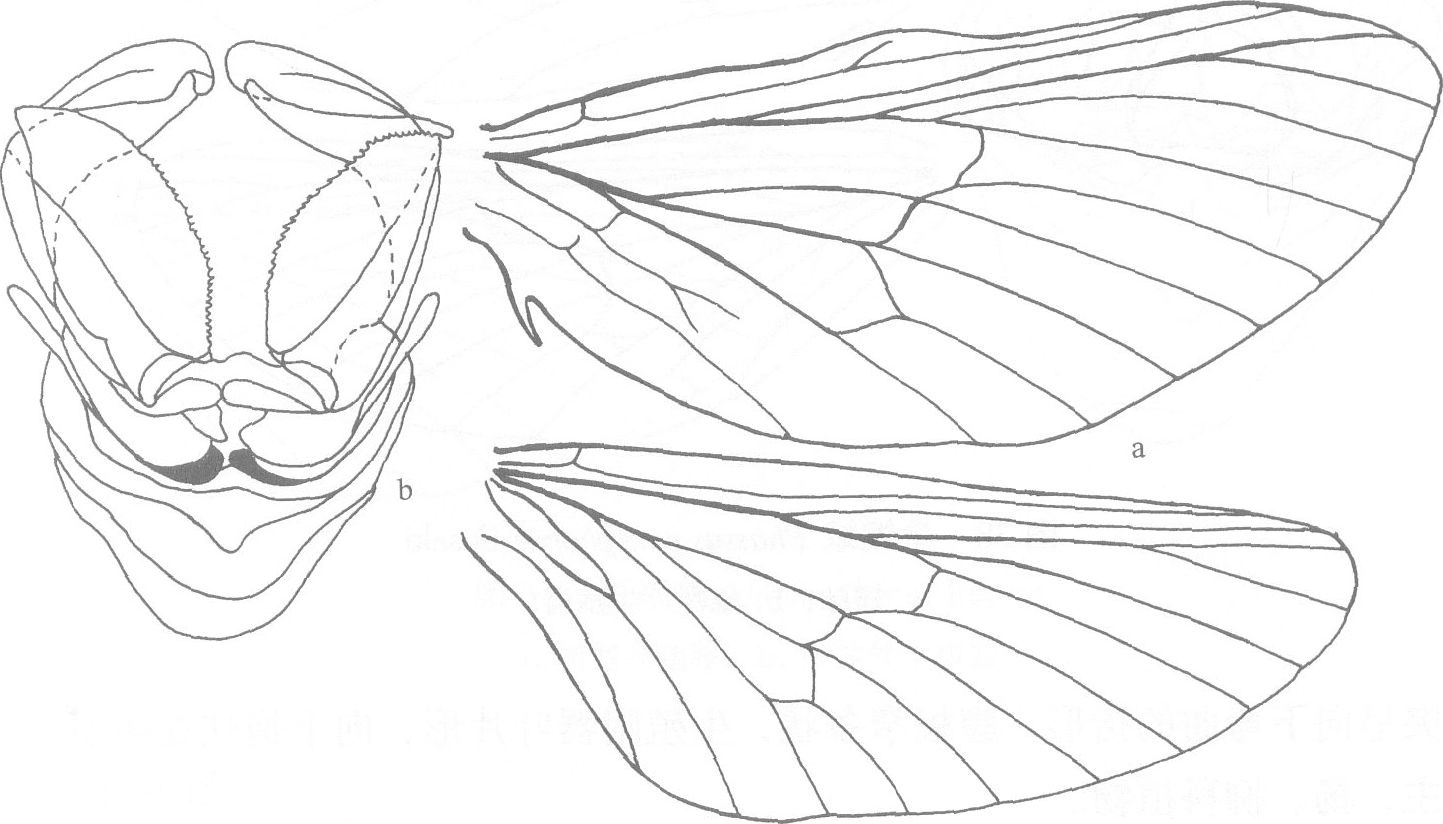 翅长60mm,体长65mm,是我们现有蝙蝠蛾科标本中最大体型种类。头小、披有杏黄至黄褐色密集毛,后缘直,领片色偏深,复眼大,约占头的2/3强,赭黄色,有黑色散斑,触角24节,丝状,各节长大于宽,下唇须短,喙退化只见有泡状突,胸部狭长,约占体长的1/3,前胸背板...