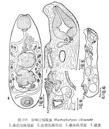 成虫形态(图194) 虫体短圆柱形灰白色,体前端狭小、后端钝圆,体表光滑、体长5.4—7.5,两体侧近平行、宽2.0—2.5毫米,体宽与体长的比例为1:2,8,口吸盘位于虫体亚前端呈梨形,0.96—1.48×1.08—1.20,直径与体长比例为1:5.3。腹...