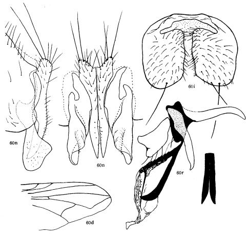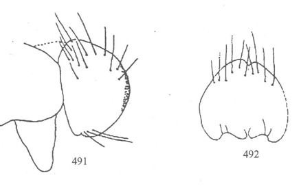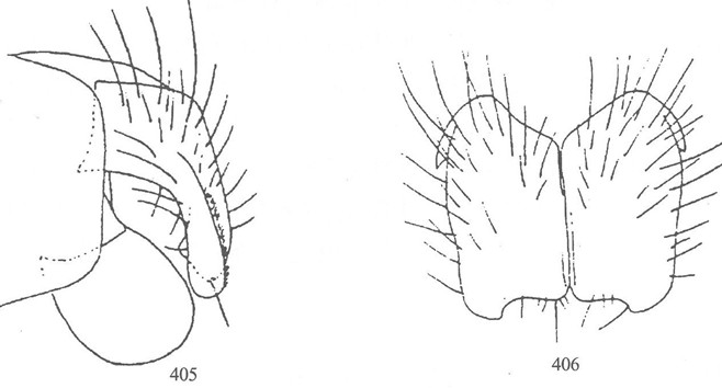 形态 ♂:体长约为8.0mm。眼密生深棕色长纤毛;额较狭,等于或稍大于前单眼宽;下眶鬃延伸至单眼三角前,无上眶鬃;触角黑,较短,第三节长为宽的2倍弱;芒长羽状;侧颜中部稍宽于触角第三节宽;颊前上缘具2列不规则的上倾口缘鬃;口上片显著突出于额前缘;下颚须黑,细...