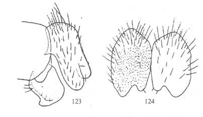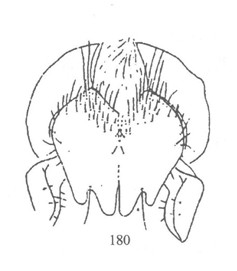 雄性 头顶平,具黑色毛,单眼三角为等腰三角形;额平,被灰色粉被和黑色毛;颜狭,两侧近平行,被灰色粉被,中突和口缘黑色裸,中突狭;眼缘适当宽,被密灰色粉被和白色短毛;颊低,被灰色薄粉和黄色毛;新月片褐色。复眼具密黄色长毛,两眼连接角90o,其连线明显较额长。触...