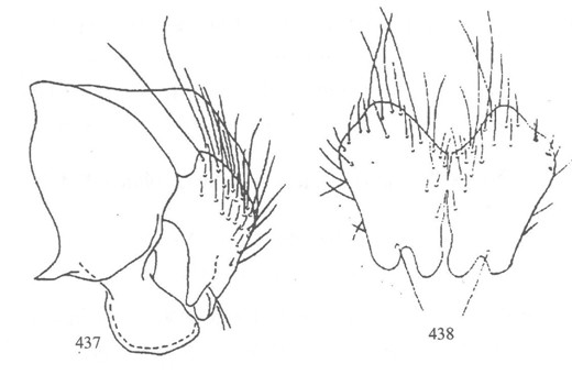 形态 ♂:体长6.5mm。眼疏生短纤毛;额宽等于前单眼宽;下眶鬃5对,无上眶鬃;侧额、侧颜和颊具银灰色粉被;侧颜为触角第三节宽的2/3宽;触角基部两节和第三节基部黄色,芒基部以下为暗黄色;芒长羽状,最长芒毛为触角第三节宽的1.4倍;颊具1列上倾口缘鬃;口上片...