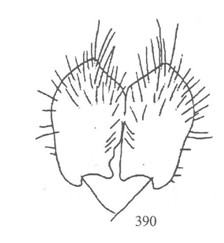 体粗壮,多毛。头黑色,雄性头顶三角长,单眼前覆白粉被和同色直立长毛,其后毛黑色,长;雄性额和颜覆白粉被,额突两侧及其下颜两侧具黄斑,额中央黑色;颜正中具黑色中条;颊黑色,光亮,在复眼正下方具红褐色斑;后头密覆白粉被和同色长毛。触角黄褐色至黑褐色,第3节上侧圆,...