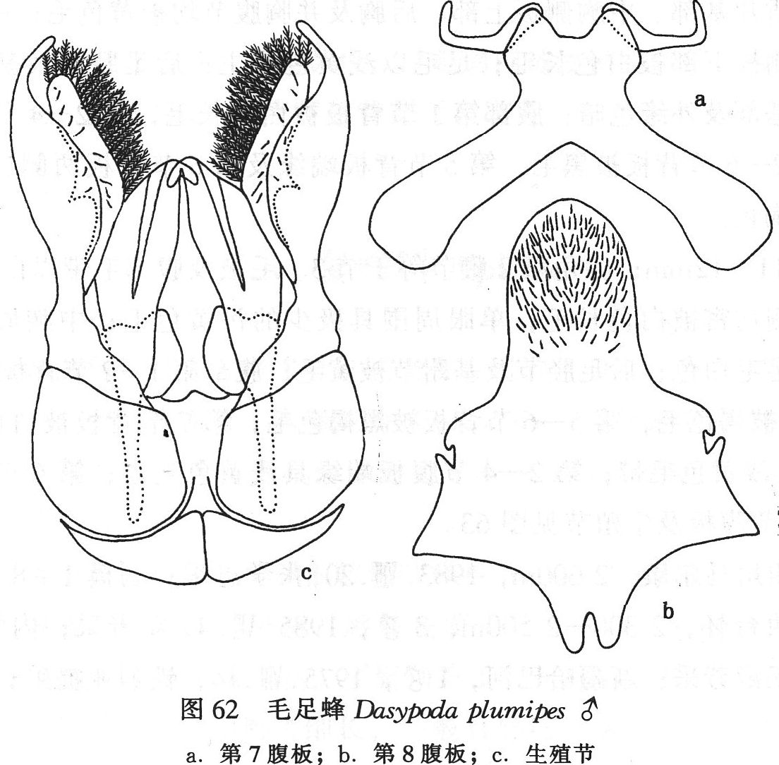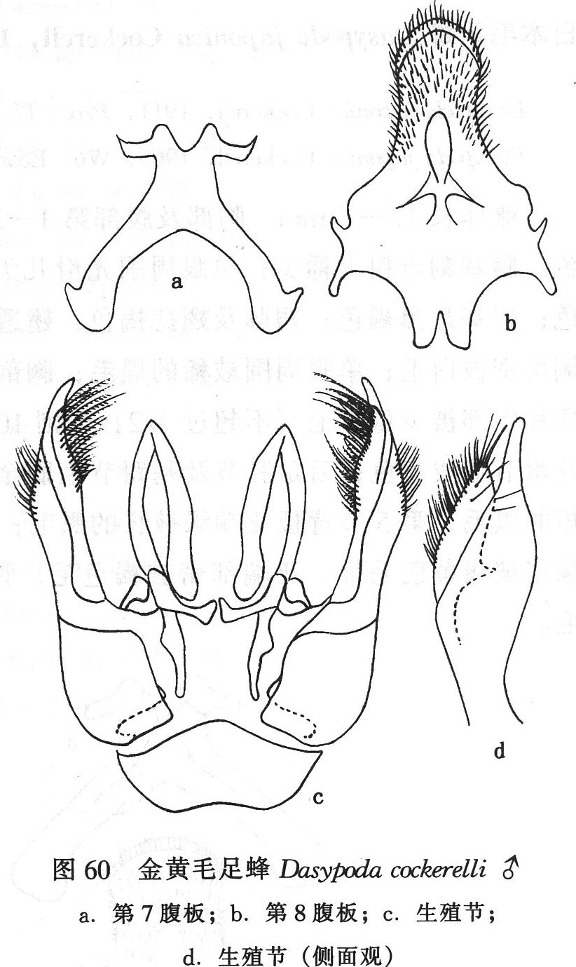 D.japonica。区别为:触角第2鞭节明显长于节3;腹部第1—5节背板被稀疏的浅黄或白色长毛,第5—6节(有时第4节)杂有少量黑色短毛,第7节背板被白毛;生殖刺突被羽状长毛(图60)。