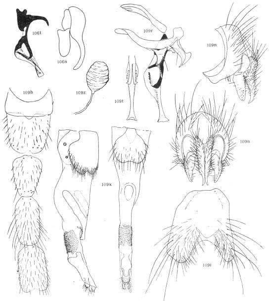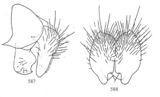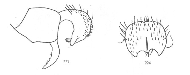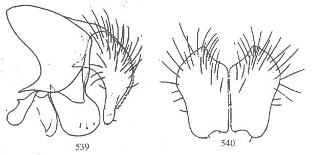 形态 ♂:体长5.7mm。额宽为前单眼宽的2倍,间额消失;下眶鬃达单眼三角处,但仅下部3—4对长大;眼具淡色微毛;侧颜狭,仅为触角宽的1/2;芒羽状,其上最长纤毛不超过触角宽;颊狭;口上片不突出;中喙粗短,下颚须细棒状。胸黑,中鬃0+1,背中鬃2+3,翅前鬃...