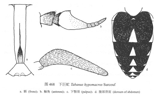 雌性体长20 mm,黑色带红。复眼绿色无带;额棕色,覆黑毛和白毛,额项宽大于基宽,高为基宽的8—10倍;额基胛棕黑色,条形,与亚胛接触,与复眼分离;中胛黑色,为基胛的细延线,头顶具小的光裸区;亚胛黄色,覆粉,“眉片”低,棕色;颜灰色,覆...