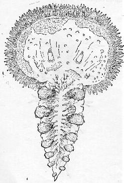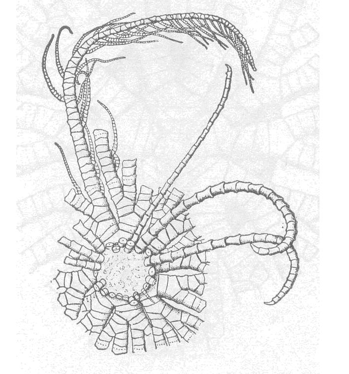 中背板大,成盘形,背极很宽,直径5-10毫米,中央内凹成圆形小孔。卷枝窝排列成不规则和密挤的H圈。卷枝XXX-XL个,由18-25节构成,长约30-35毫米。卷枝粗,各节的中央部压缩成结节状,无背棘或背疣;第1节短,宽为长的2倍,第2节略长,第3节长和宽相近,...