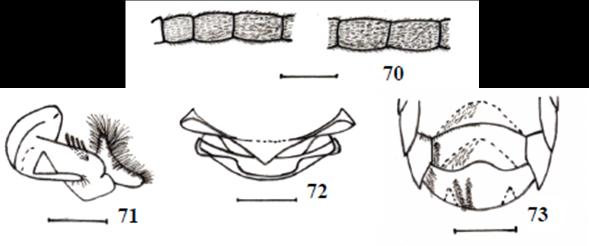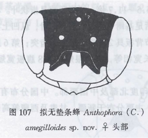 雌体长12mm;头宽;唇基黑色具黄斑;腹部第1-4节背板端缘具宽的白毛带。唇基(侧面观)约为复眼宽的2/3(图107),表面刻点细小且整齐;上唇刻点粗大;触角第1鞭节长等于节2+3+4;