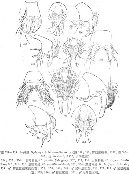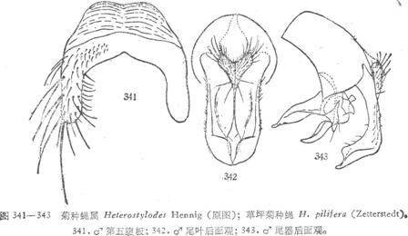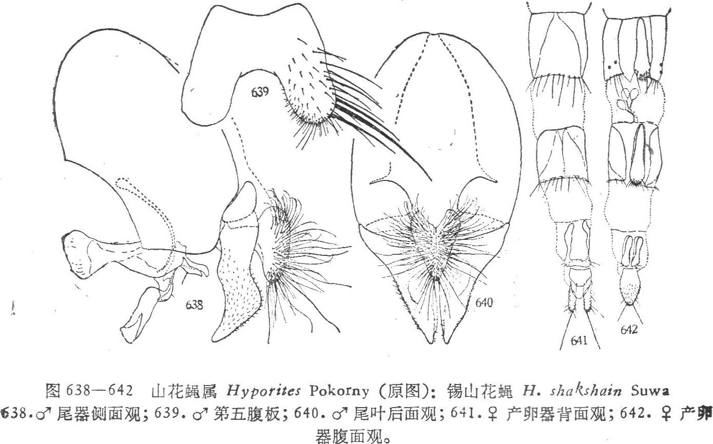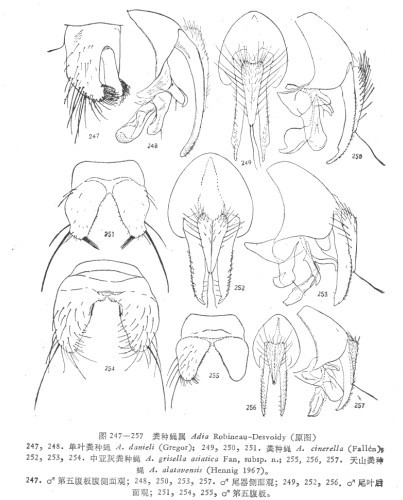 形态特征 ♂ 体长4.0—5.0毫米。♂ 额约与前单眼等宽,间额棕黑在最狭处消失,有上眶鬃和间额鬃各一对,下眶鬃4对,头前面粉被银白,侧颜约为触角第三节宽的触角黑,第三节为第二节的2倍,芒羽状,最长分枝毛约为触角第二节的2倍宽;前方的口缘鬃一行,...