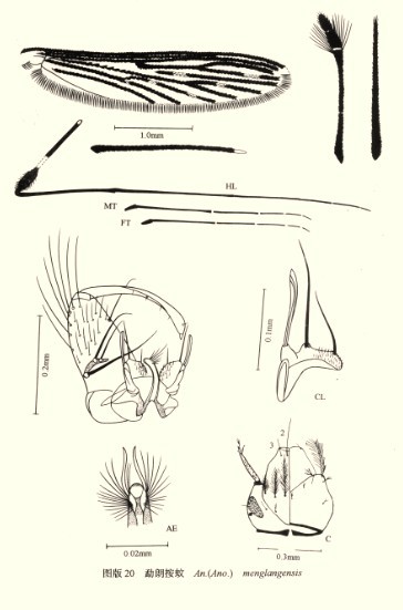 雌蚊中型蚊虫,棕褐或黄褐色,翅长3.7-4.lmm。头:白...