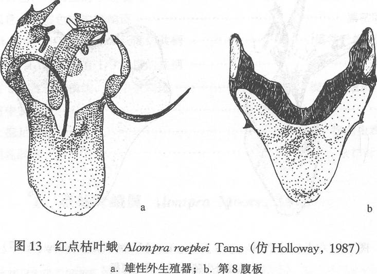 外形与六点枯叶蛾 Alompra ferruginea Moore很相似,但前翅具红褐色的横线是本种的鉴别特征。雄蛾前翅较宽,外缘中部内凹。