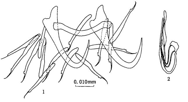 边缘小钩全长0.016—0.026mm。中央大钩全长0.034—0.037mm,钩尖长0.014—0.016mm。联结片单一,似一字形,大小为0.002—0....