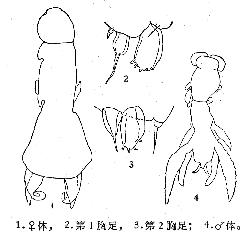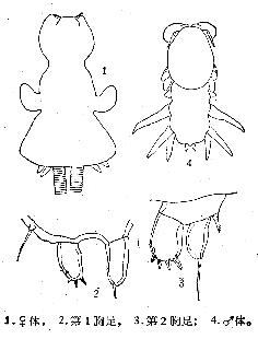 部小。躯干部的前半部窄长,其前、后两侧角各有一个向腹面延伸的突起;后半部扩展成裙状。卵囊11.5×0.32毫米。第1触角7节。第1