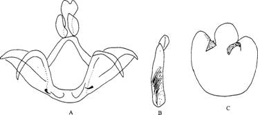 头近方形,前部额面铲状,凹陷,额脊在头顶成2个耸叶状高起,背面成宽V形凹刻,但不中断,头盖缝仅有纵干,缝干区略凹下,上颚短粗,颚端稍弯,齿
