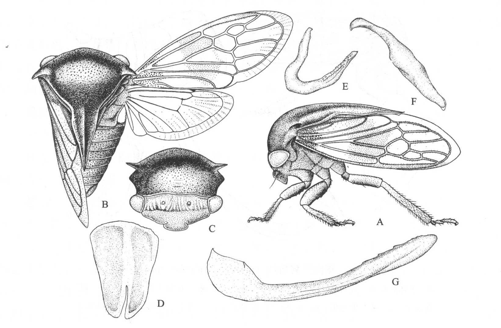 雄性 体中型。颜面倾斜,同头顶组成锐角形;颜面隆起狭,具深纵沟。头顶突出,自复眼前缘到头顶顶端的距离略大于复眼前最宽处,头顶具明显的中隆线,在中隆线两侧具不