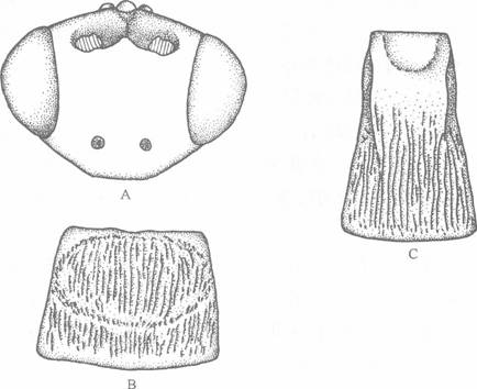顶具稀疏的刻点;额凹浅,侧面具稀疏的细刻点;触角36节;颚眼距为上颚基宽的2.1倍;颊背后观呈直角。