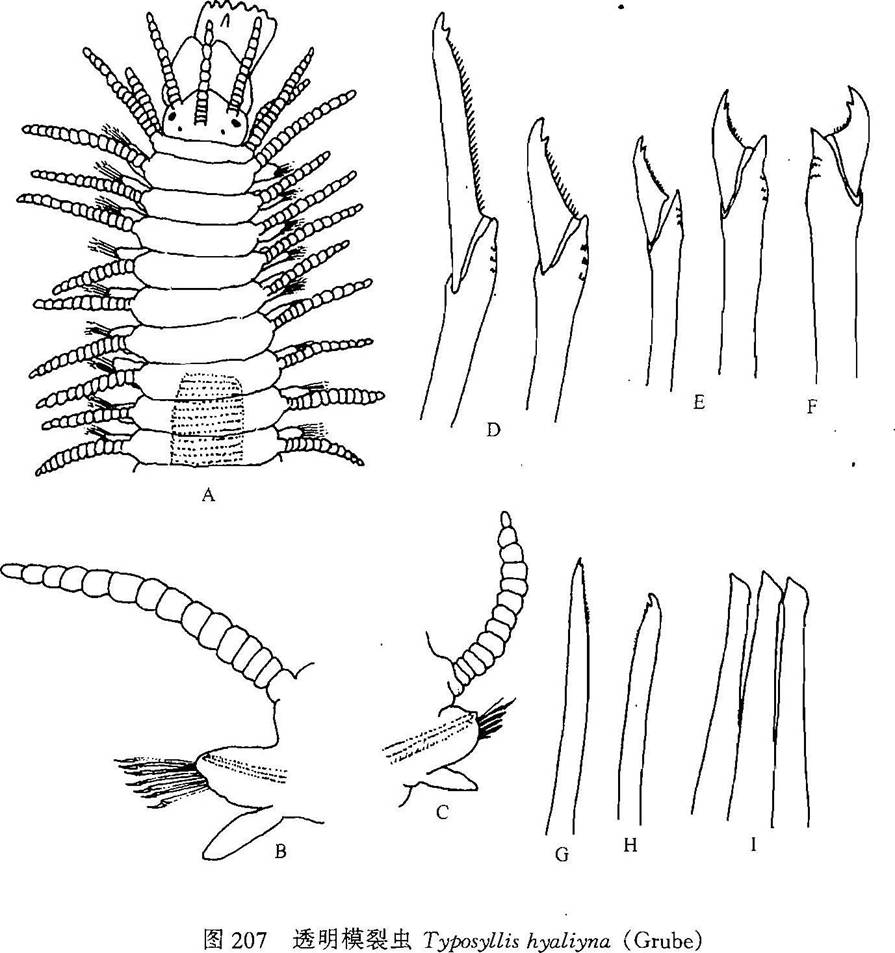 形态特征 体长8—16 mm,体宽(含疣足)0.5—1 mm,具70—110个刚节。