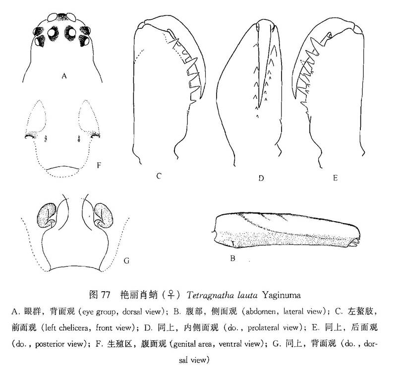 雌蛛体长4.60—6.00。一雌蛛体长4.89:头胸部长1.39,宽0.92;腹部长3.78,宽0.92。螯肢长0.61。背