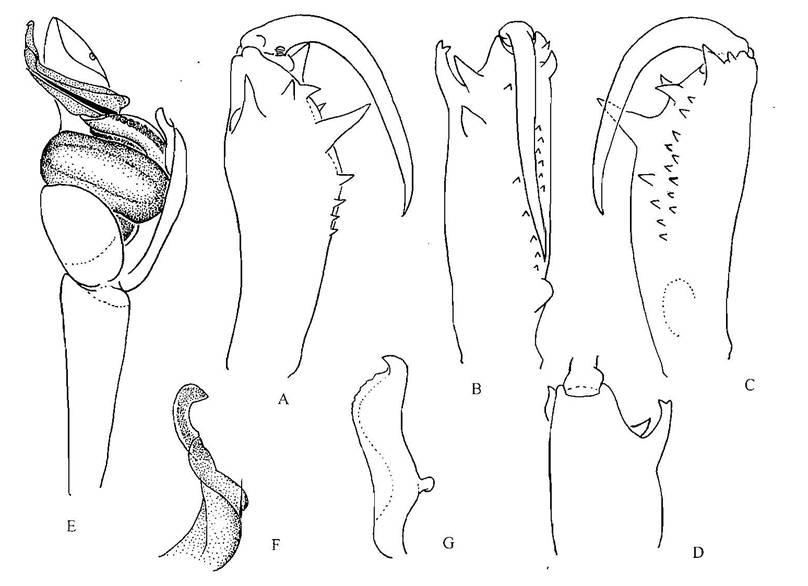 ,前面隔开螯牙基部一段距离的中央具一顶部不分叉的婚距。前