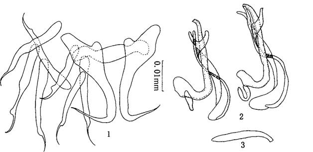 体小型,体长0.248-0.330mm,体宽0.067-0.lOOmm。边缘小钩发育良好,长0.017-0.033mm,其中第4、5、6对较长。中央大钩全长0.030-0.033mm,基部长0.026mm,内突0.007---0.O08mm,外突...