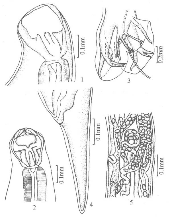 头端弯向背面。口囊漏斗状,口囊背侧有1大背槽,背沟由此穿出,口囊腹侧有2对刀状齿。食道前1/3部柱形,向后逐渐扩大呈棒状。神经环位于食道前1/3部处,排泄孔和颈乳突在神经环同一