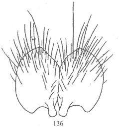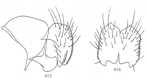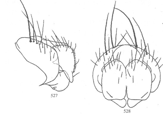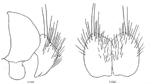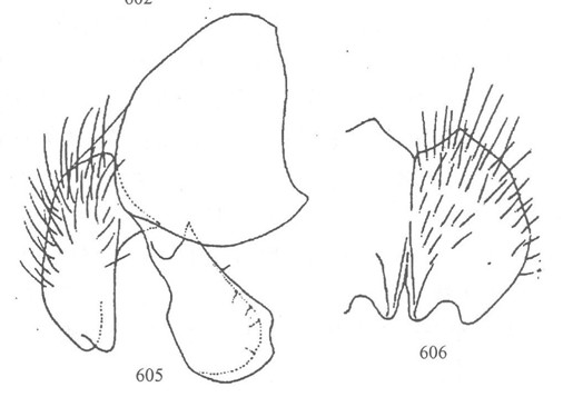 形态 ♂:体长约7.5mm。眼密生棕色长纤毛;额最狭处约等于后单眼外缘间距,间额宽于侧额;下眶鬃达于单眼三角附近,以下半部的鬃为长大,无上眶鬃;触角黑,第三节长为宽的2倍;长羽状,最长芒毛为触角第三节宽的1.5倍;侧颜具黄粉被,宽约为触角第三节宽的1.5倍强...