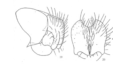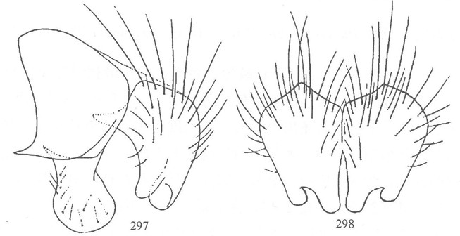 形态 ♂:体长6.5—7.0mm。眼略疏生中等长纤毛;额宽约等于触角宽,间额最狭处为一侧额宽的1/2;下眶鬃10对,接近单眼三角;侧颜约等于触角宽;触角黑,芒长羽状,最长芒毛长为触角宽的2倍;颊高约为眼高2/7,颊后头沟之后和下后头全为浅黄色毛;颊前上缘有1...